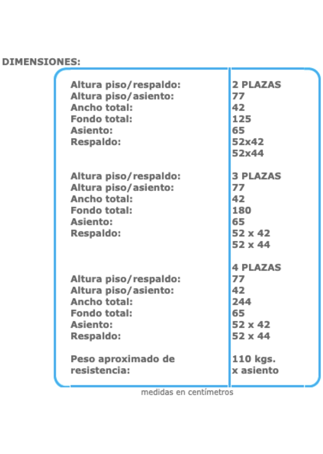 – Asiento y respaldo ensamblados en patas y soporte por medio de anclajes de aluminio con embellecedores de aluminio pulido, soporte horizontal ensamblado con sujetador de estructura en lamina de acero en frio cal. 12 totalmente armada, en color gris