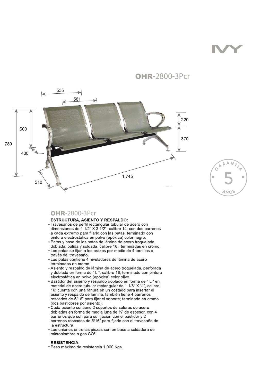 estructura: de acero tubular rectangular de 1 1/2″ X 3 1/2″, calibre 14, con acabado de pintura epóxica (electrostática) color negro mate. Patas y base de las patas de lámina de acero troquelada, calibre 16; contiene niveladores. Terminado en cromo.