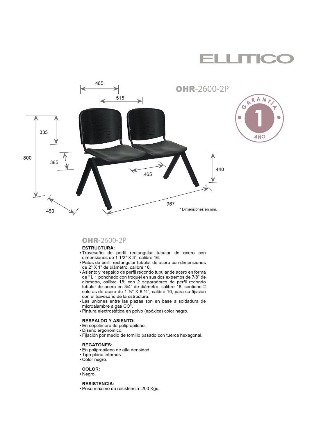 estructura: de acero tubular rectangular de 1 1/2″ X 3″, calibre 16, asientos y respaldos de perfil redondo tubular de acero con travesaños separadores tubulares redondos de acero con acabado de pintura epóxica (electrostática) color negro mate.
