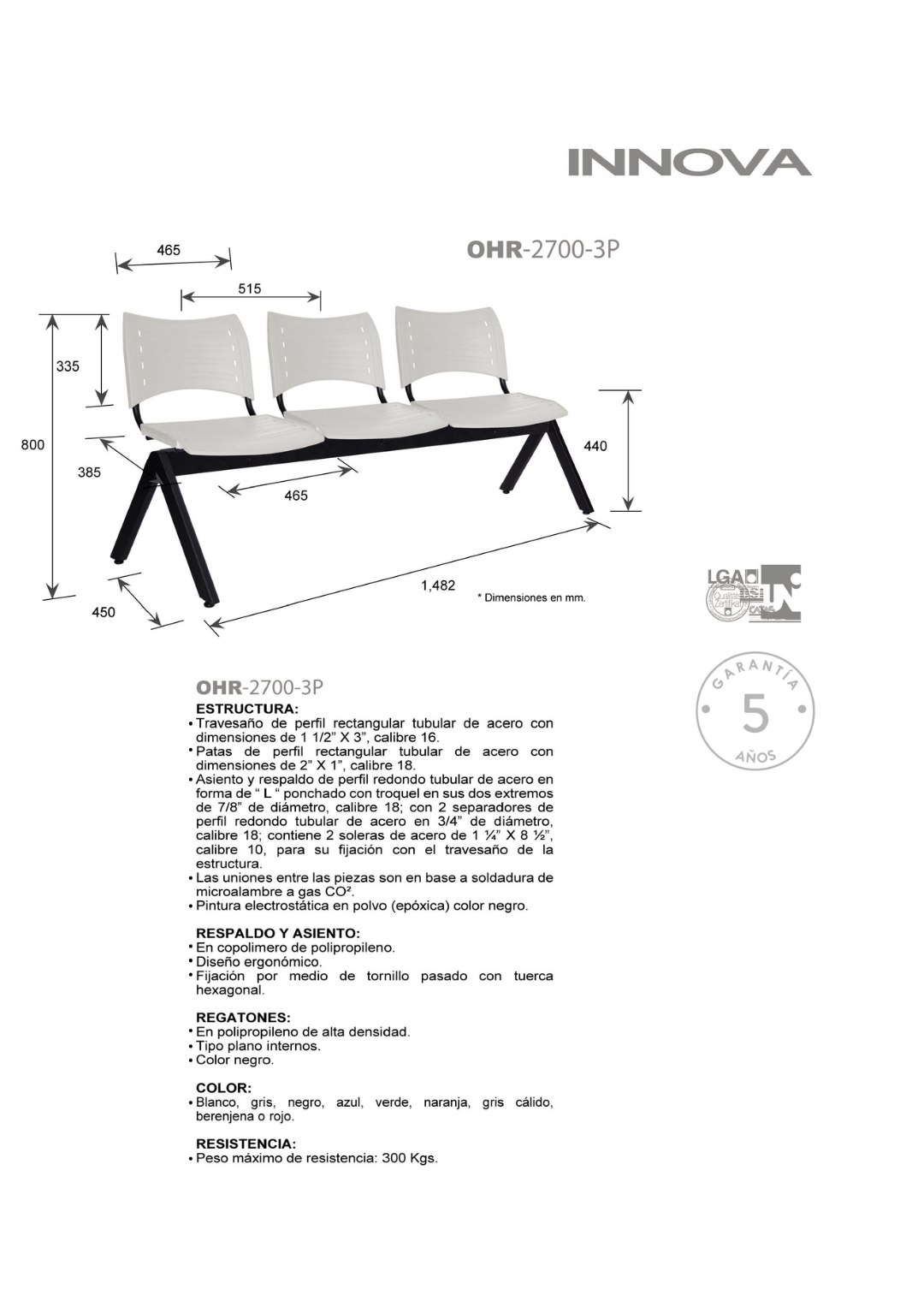 estructura: de acero tubular rectangular de 1 1/2″ X 3″, calibre 16, asientos y respaldos de perfil redondo tubular ponchado de acero con travesaños separadores tubulares redondos de acero con acabado de pintura epóxica (electrostática) color negro.