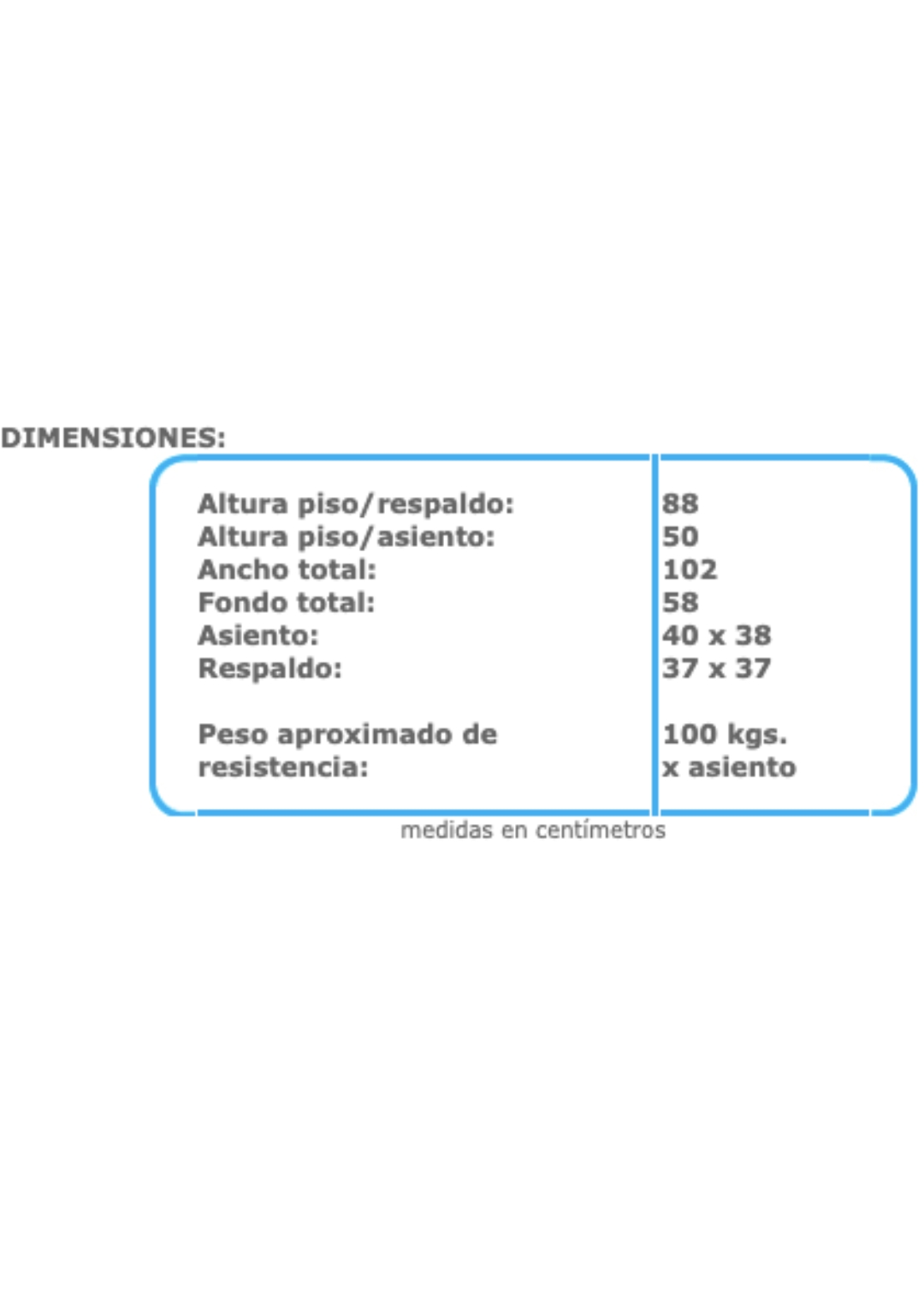 | ESTRUCTURA – Travesaño y patas perfil rectangular de 1½”x3” cal. 18, refuerzo en respaldo de tubular redondo de 5/8” cal. 18 en forma de “U”, terminado en pintura epóxica texturizada color negro, niveladores de 2” de polietileno con tornillo de 5/16″ para ajuste de altura. RESPALDO Y ASIENTO – 2 plazas de concha de plástica de polipropileno de una sola pieza, sin tapiz. |