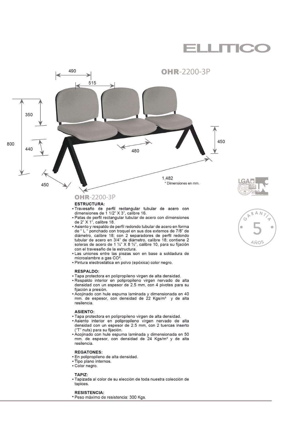 estructura: de acero tubular rectangular de 1 1/2″ X 3″, calibre 16, asientos y respaldos de perfil redondo tubular de acero ponchado con travesaños separadores tubulares redondos de acero con acabado de pintura epóxica (electrostática) color negro mate.