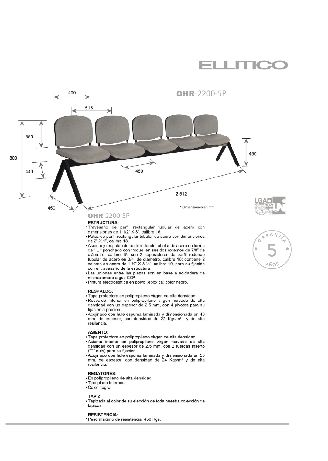 estructura: de acero tubular rectangular de 1 1/2″ X 3″, calibre 16, asientos y respaldos de perfil redondo tubular de acero ponchado con travesaños separadores tubulares redondos de acero con acabado de pintura epóxica (electrostática) color negro mate.