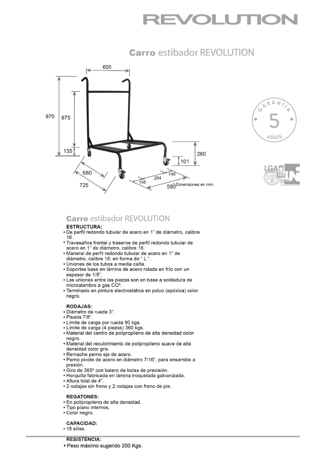estructura: de acero tubular de 1″ de diámetro, calibre 16, con acabado en pintura epóxica (electrostática) color negro mate.