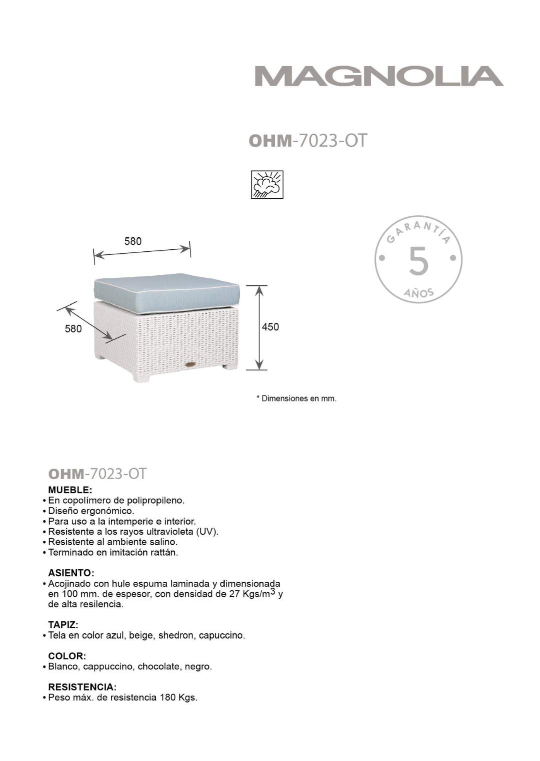 banco: en polipropileno de alta resistencia y duración para intemperie e interior, resistente a los rayos ultravioleta (UV) y al ambiente salino con terminado en imitación rattán.