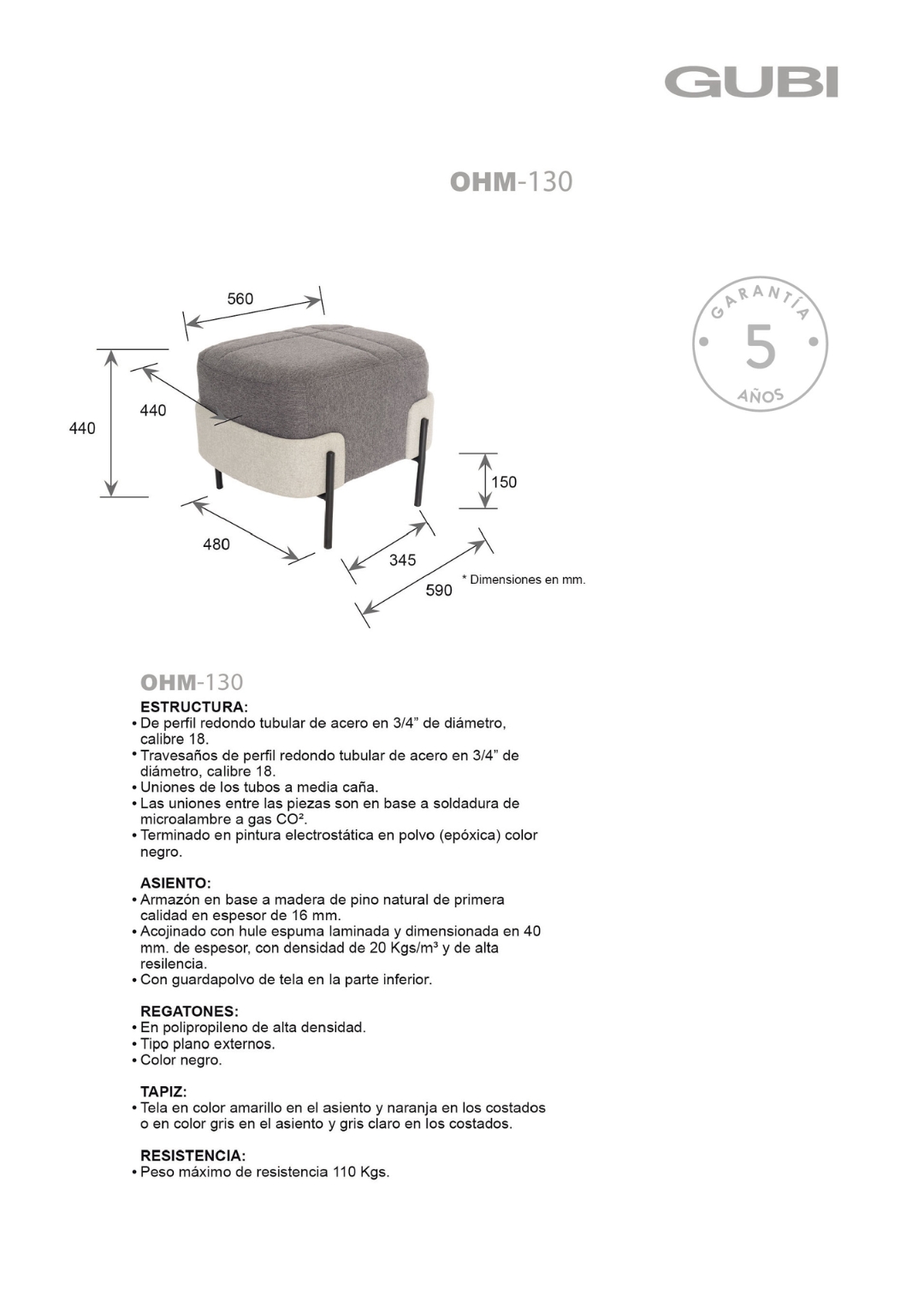 estructura: de acero tubular de 3/4″ de diámetro; con acabado de pintura epóxica (electrostática) color negro mate.