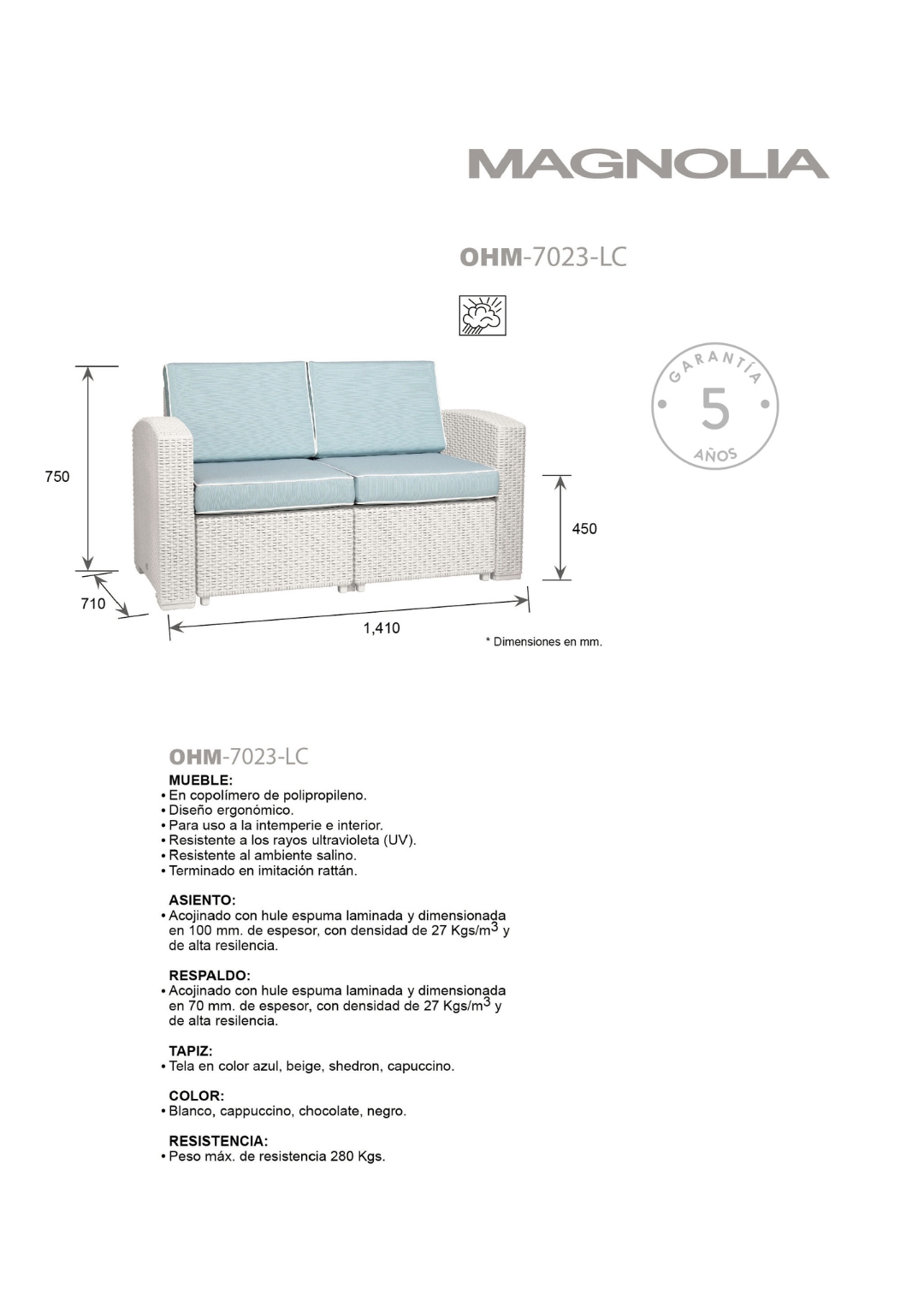 mueble: en polipropileno de alta resistencia y duración para intemperie e interior, resistente a los rayos ultravioleta (UV) y al ambiente salino con terminado en imitación rattán.