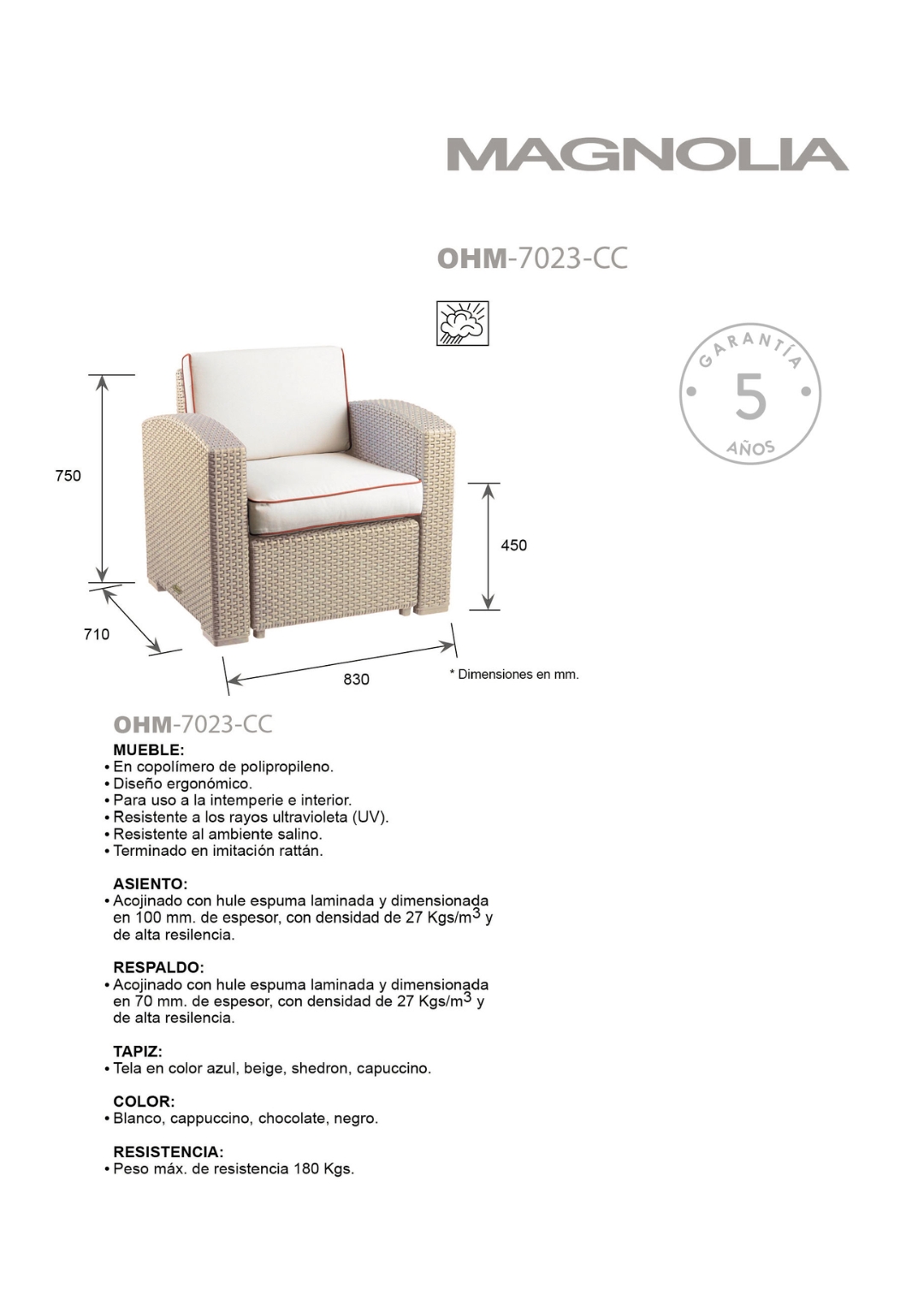 mueble: en polipropileno de alta resistencia y duración para intemperie e interior, resistente a los rayos ultravioleta (UV) y al ambiente salino con terminado en imitación rattán.