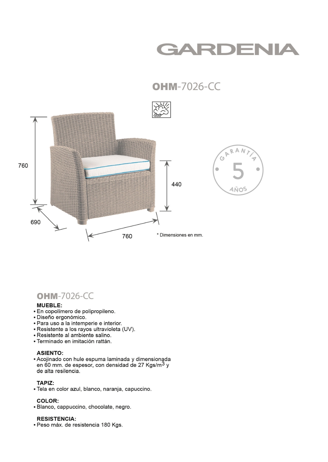 mueble: en polipropileno de alta resistencia y duración para intemperie e interior, resistente a los rayos ultravioleta (UV) y al ambiente salino con terminado en imitación rattán.