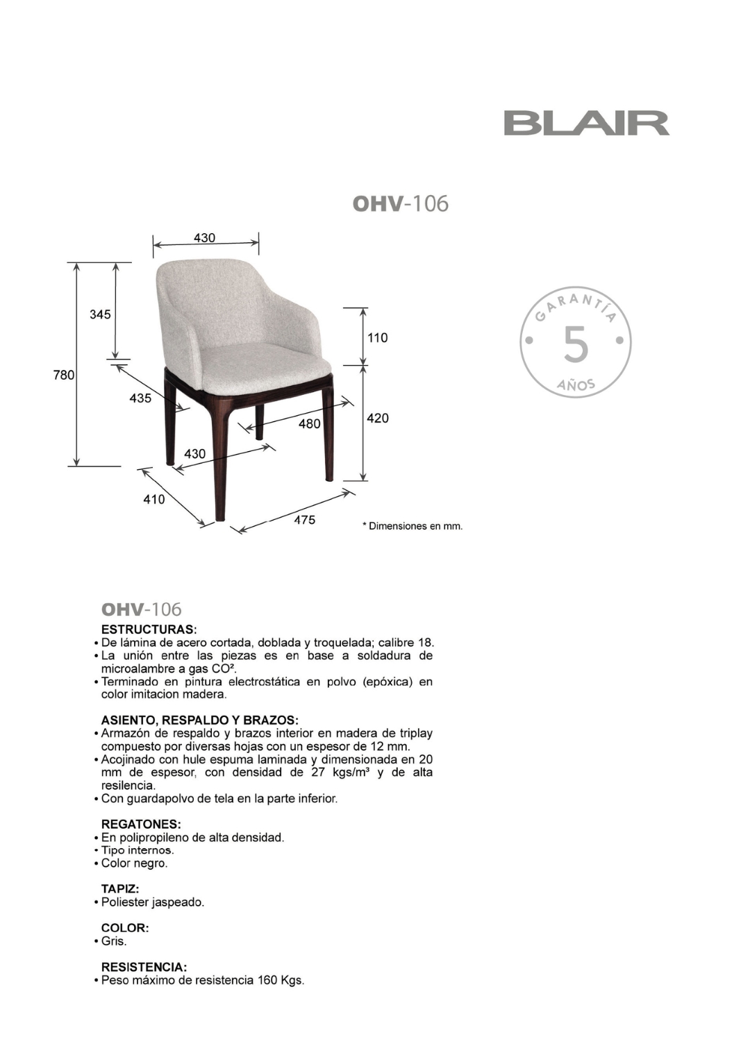 asiento, respaldo y brazos: base y armazón en madera de triplay, hule espuma laminado flexible con densidad de 27 kgs/m³ y alta resilencia.
