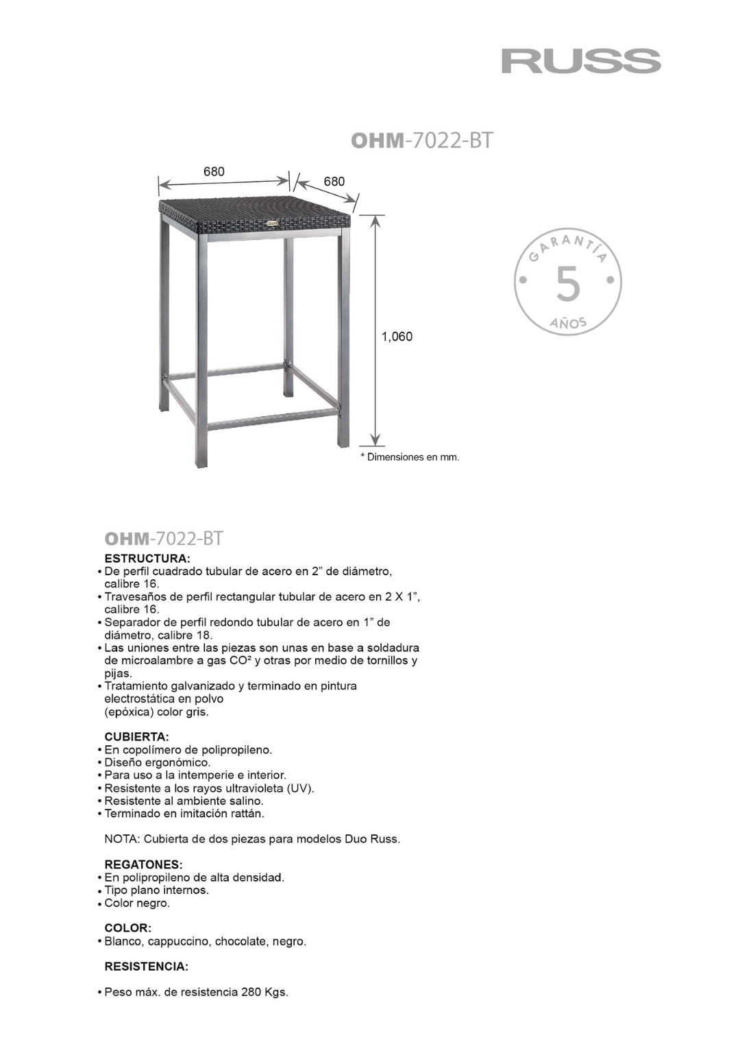 estructura: De perfil cuadrado tubular de acero, travesaños de perfil rectangular tubular de acero y separador de perfil redondo tubular de acero. Tratamiento galvanizado y terminado en pintura electrostática en polvo (epóxica) color gris.