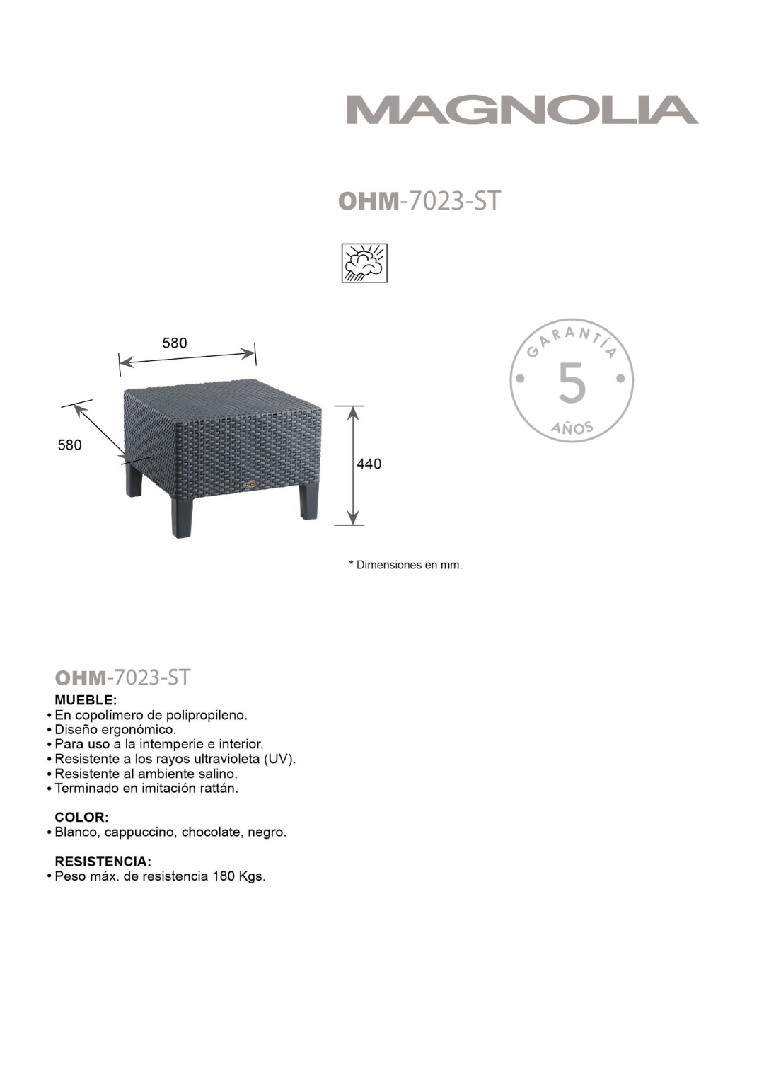 banco: en polipropileno de alta resistencia y duración para intemperie e interior, resistente a los rayos ultravioleta (UV) y al ambiente salino con terminado en imitación rattán.
