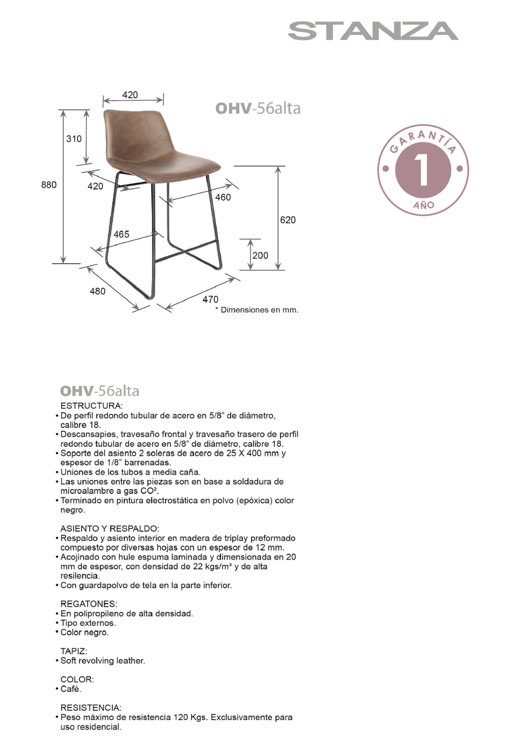 peso máximo de resistencia: 120 kgs. Exclusivamente para uso residencial.