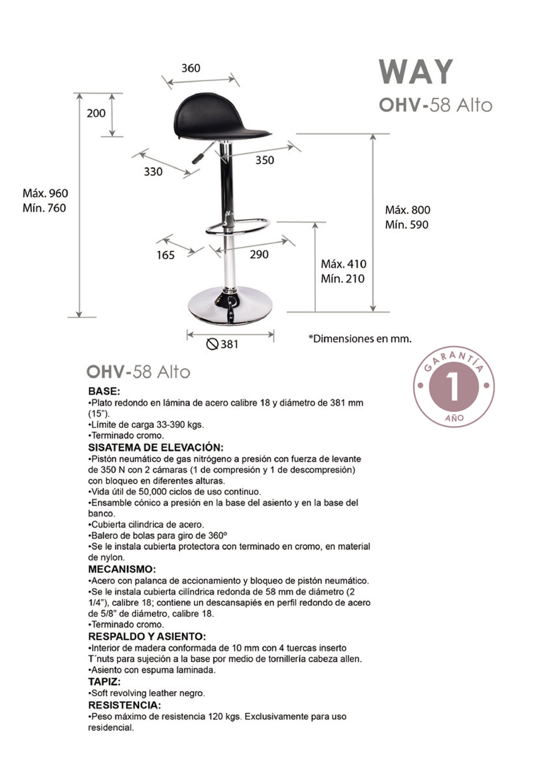 peso máximo de resistencia: 120 kgs. Exclusivamente para uso residencial.