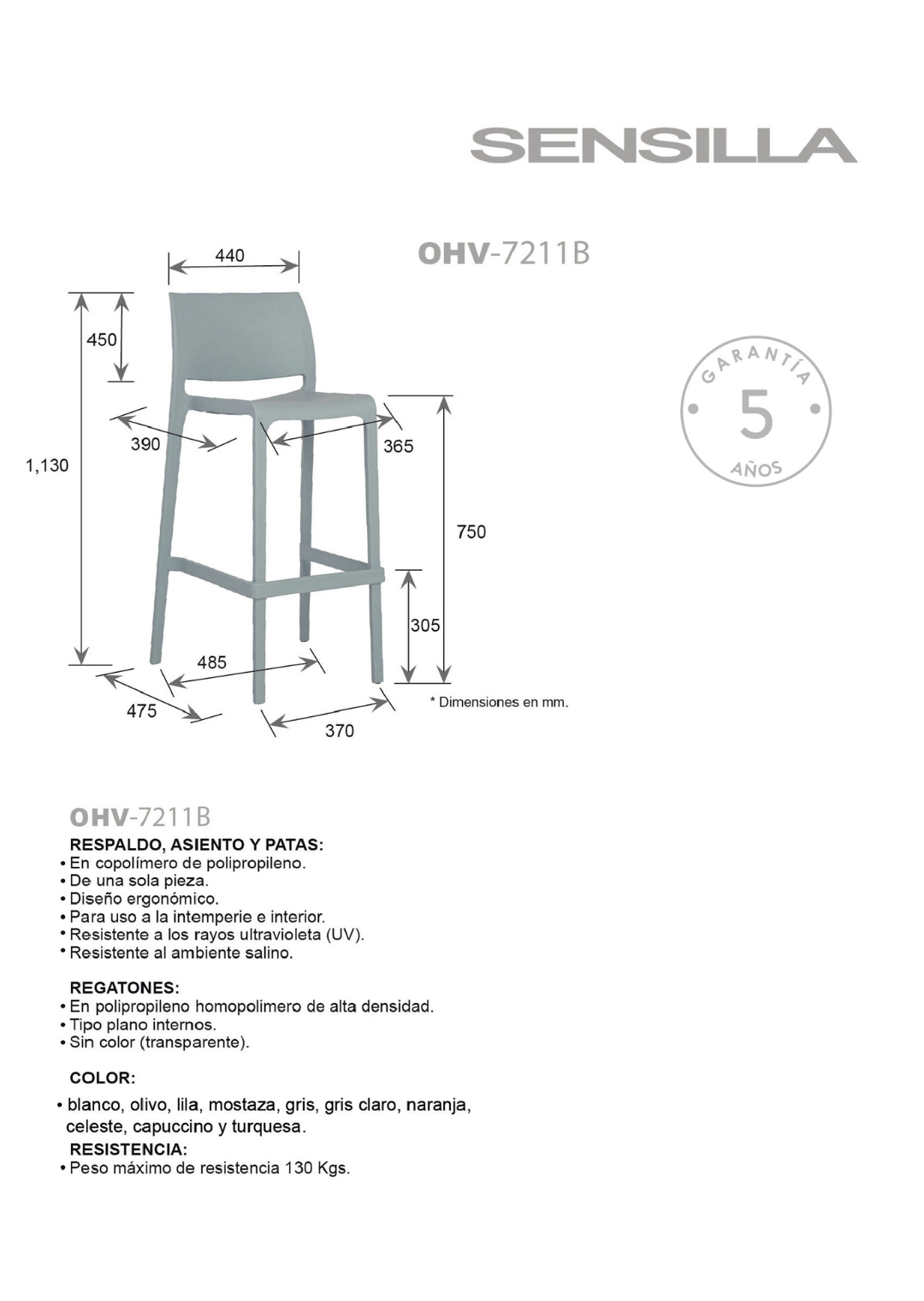 patas, asiento y respaldo: de una sola pieza en polipropileno de alta resistencia y duración para intemperie, resistente a los rayos ultravioleta (UV) y al ambiente salino.