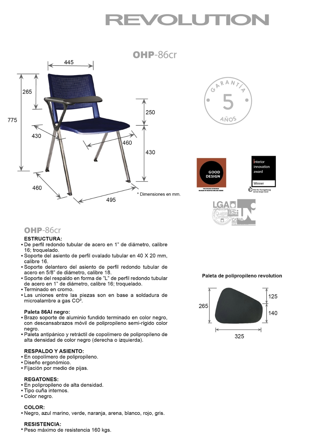 paleta lateral 86Al negro: de aluminio fundido terminado en color negro, descansabrazos móvil de polipropileno semi-rígido; paleta antipánico y retráctil de poliprolileno de alta densidad en color negro (derecho o izquierdo).