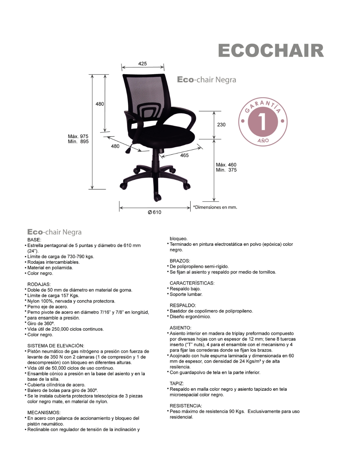 peso máximo de resistencia: 90 kgs. Exclusivamente para uso residencial.