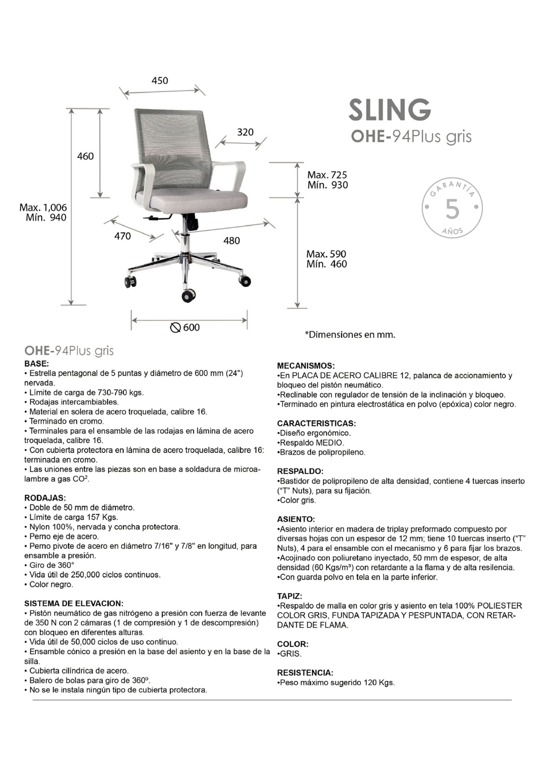 tapiz: respaldo de malla de color gris y asiento en tela 100% POLIESTER COLOR GRIS, FUNDA TAPIZADA Y PESPUNTADA, CON RETARDANTE DE FLAMA.