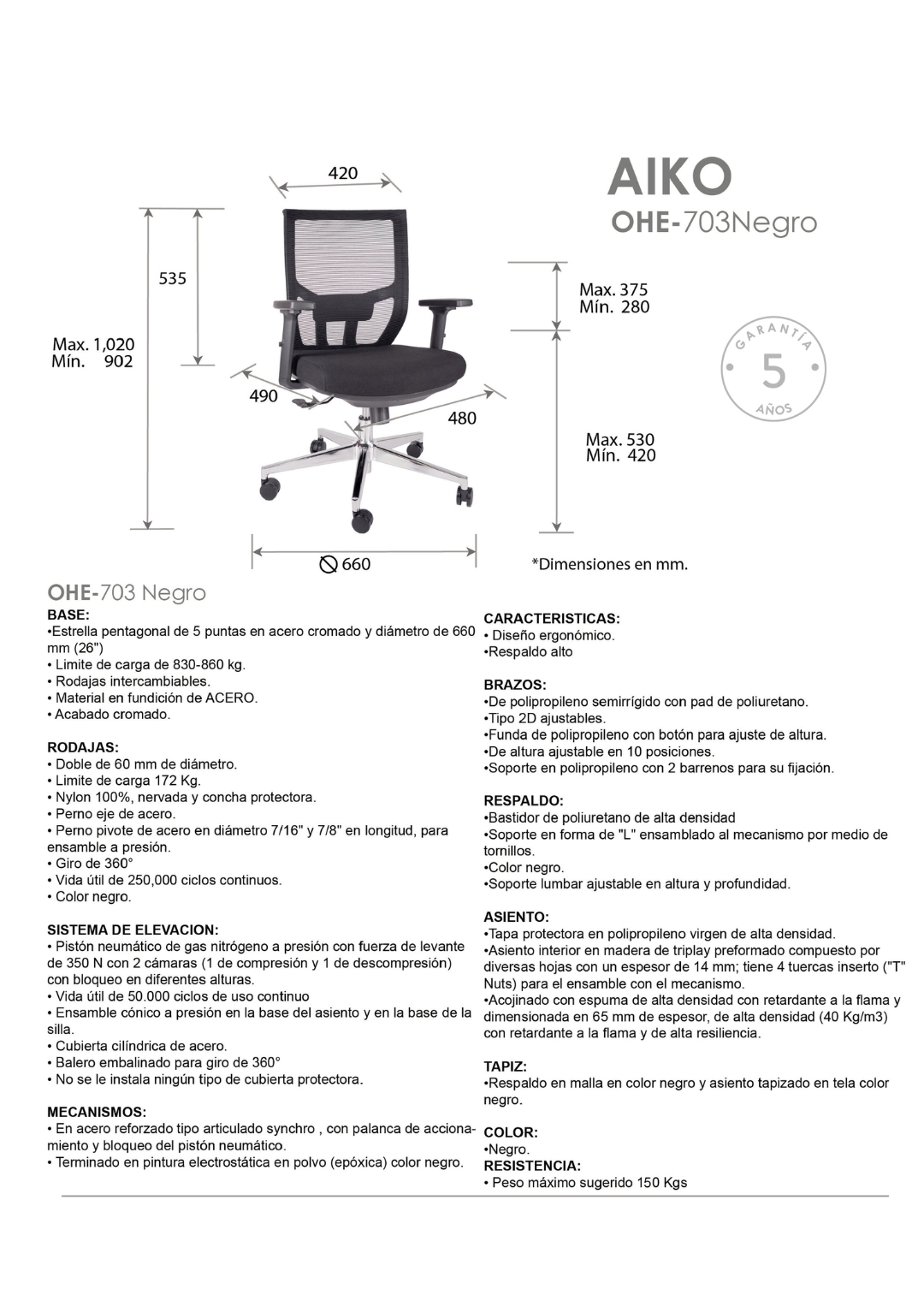 peso máximo de resistencia: 150 kgs.