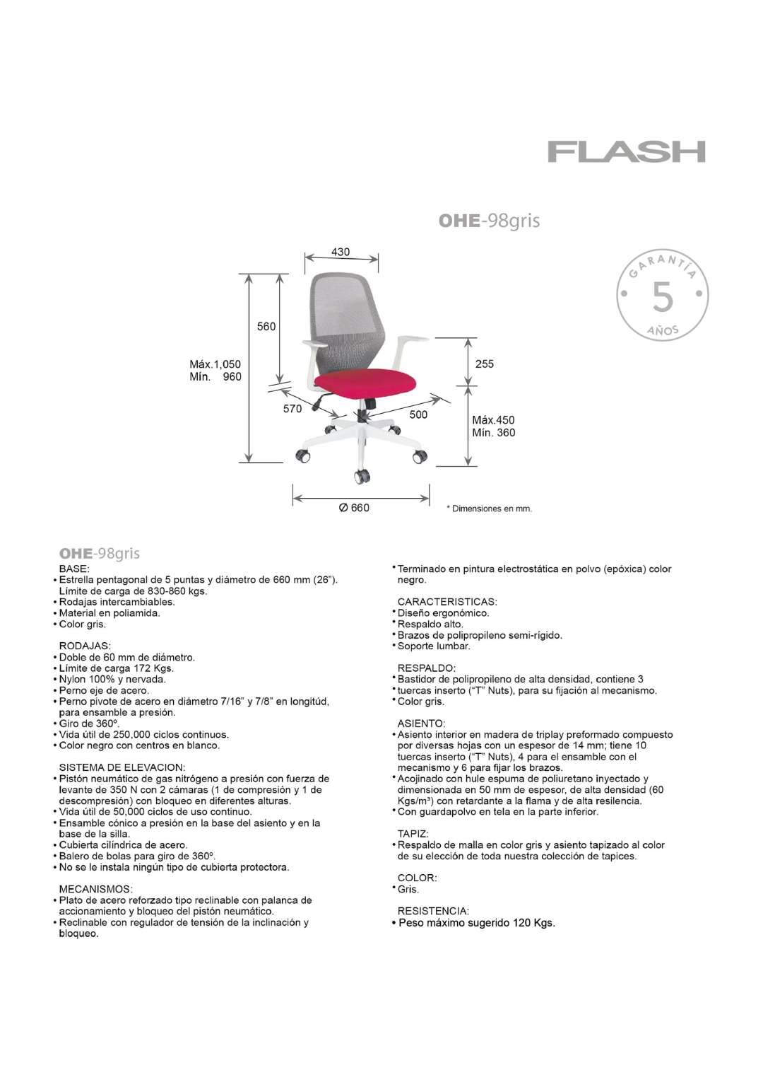 asiento: hule espuma de poliuretano inyectado con densidad de 60 kgs/m³ con retardante a la flama y alta resilencia.