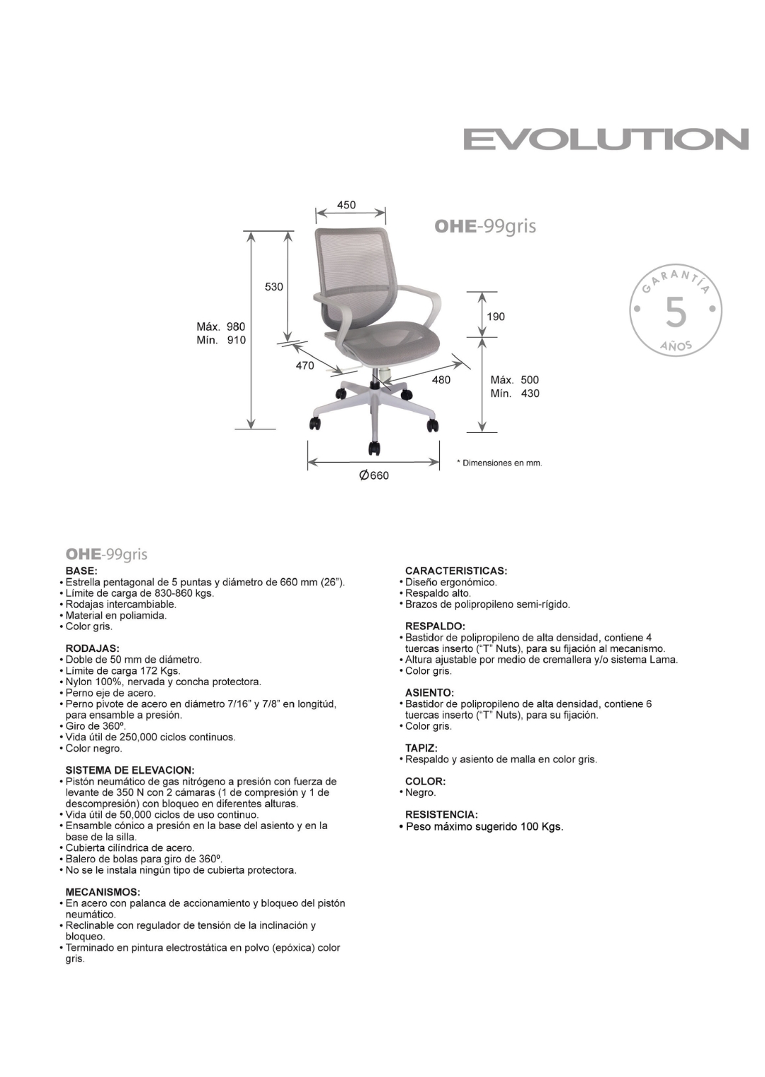 mecanismo: plato de acero reforzado con sistema de reclinación y palanca de bloqueo, perilla de regulación de tensión para el sistema de reclinación.