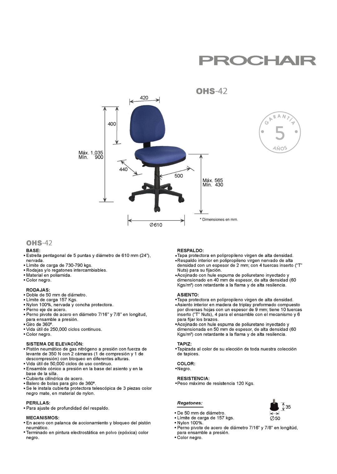 elevación: por medio de pistón neumático que permite ajustar la altura del asiento.