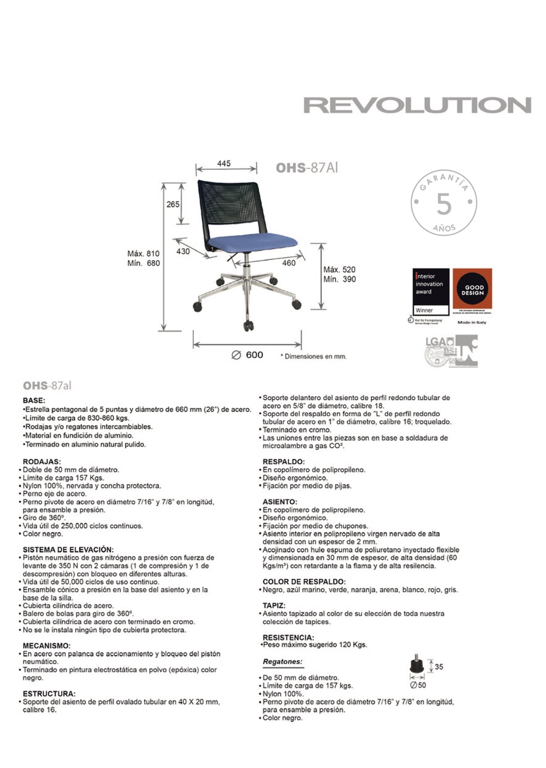 respaldo: en una pieza en polipropileno de alta resistencia y duración.