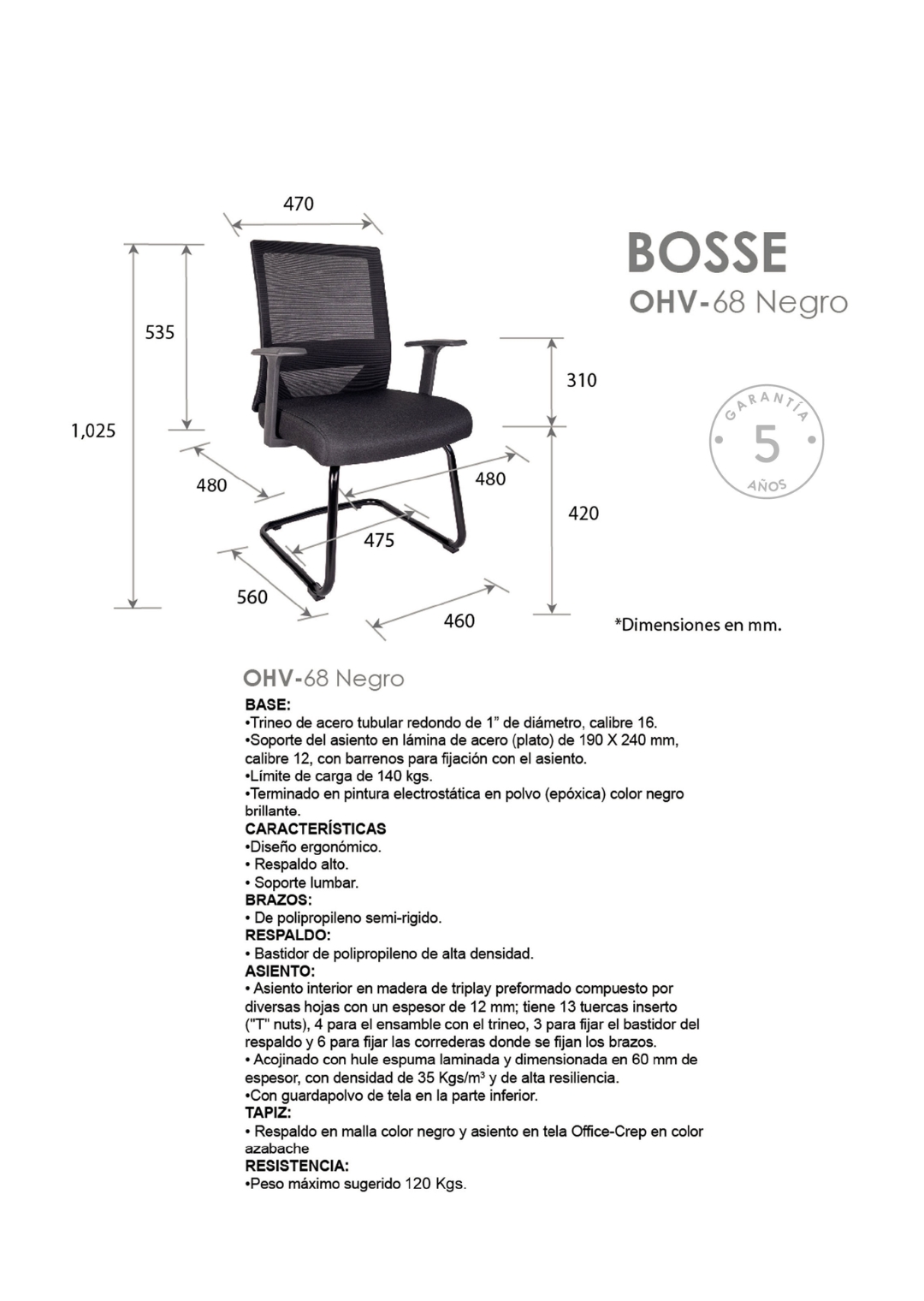 base: trineo de acero tubular de 1″ de diámetro, calibre 16; soporte del asiento en lámina de acero (plato) con acabado de pintura epóxica (electrostática) color negro.