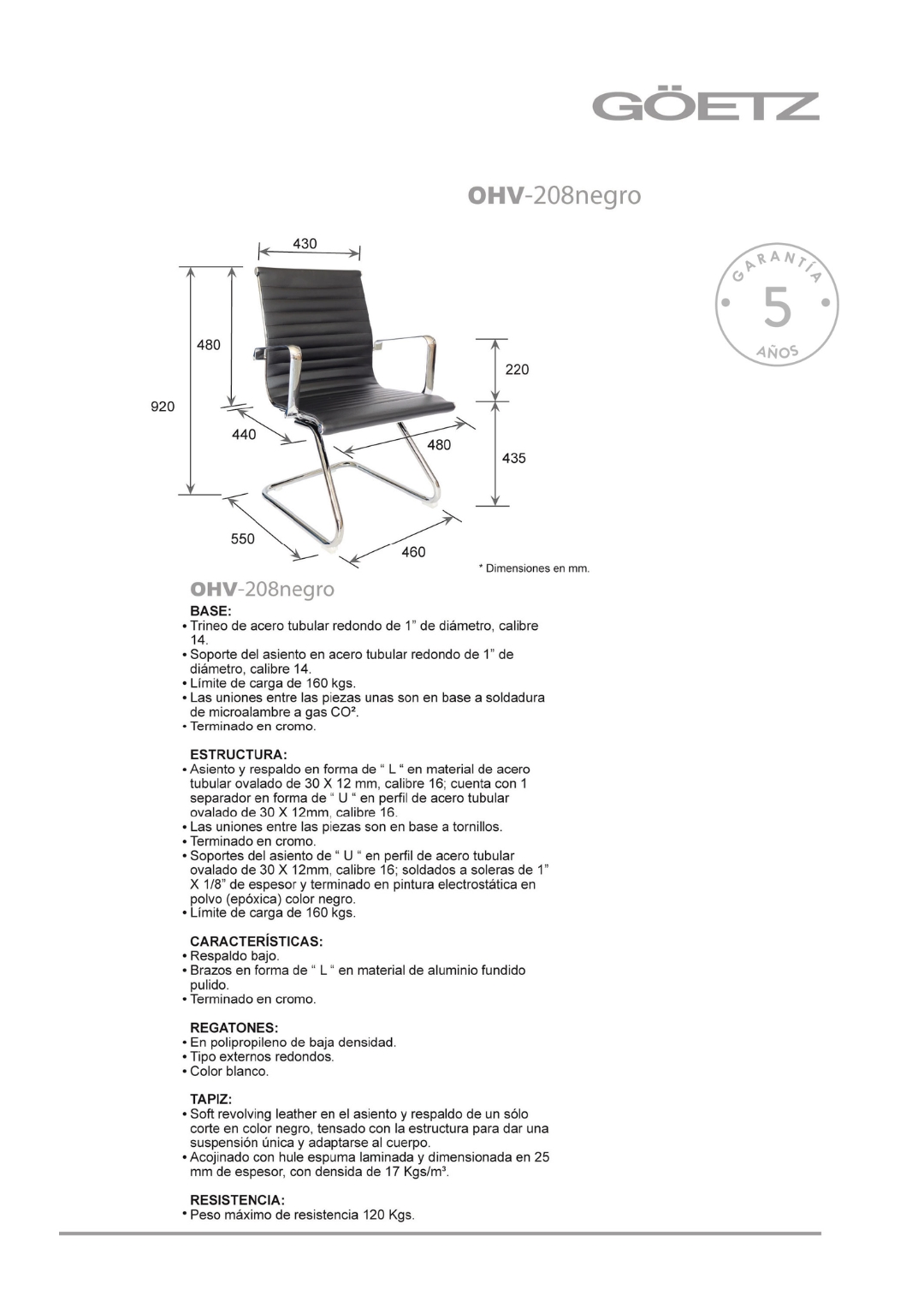 base: trineo de acero tubular redondo de 1″ de diámetro, calibre 14; con terminado en cromo.