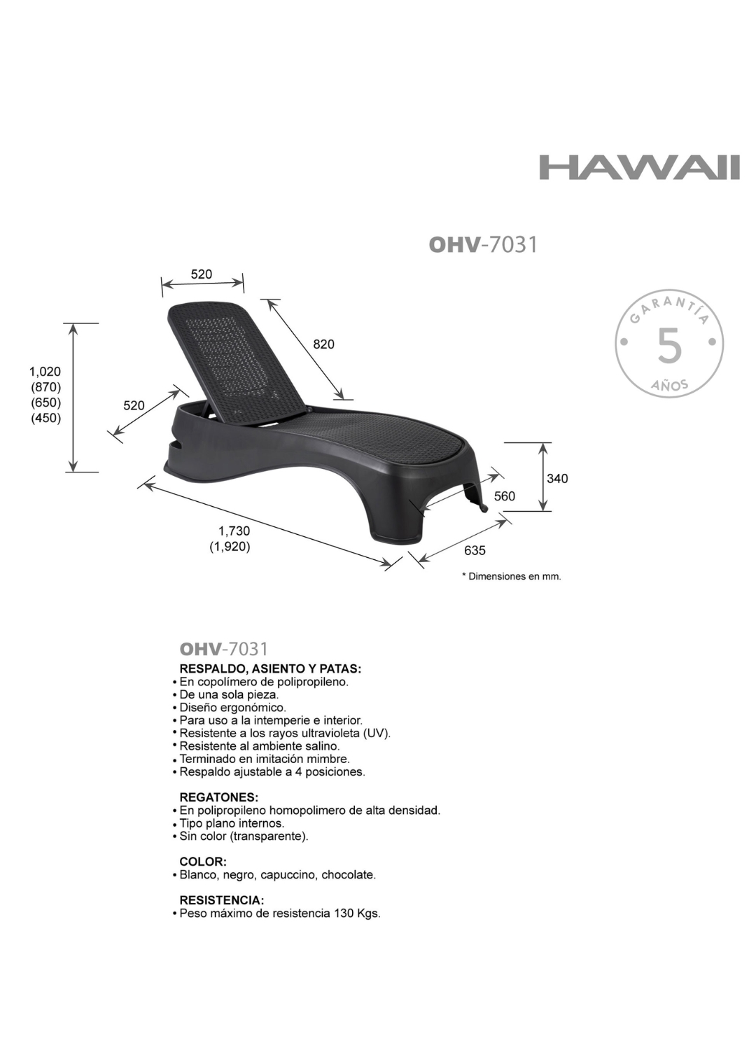 patas, asiento y respaldo: terminado en imitación mimbre de una sola pieza en polipropileno de alta resistencia y duración para intemperie, resistente a los rayos ultravioleta (UV) y al ambiente salino.