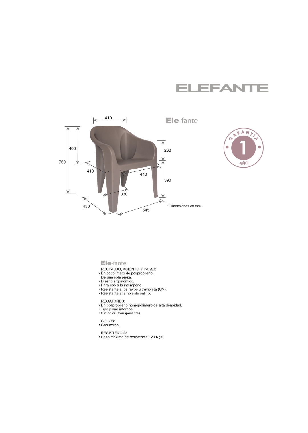 asiento, respaldo y patas: de una sola pieza en polipropileno de alta resistencia y duración.
