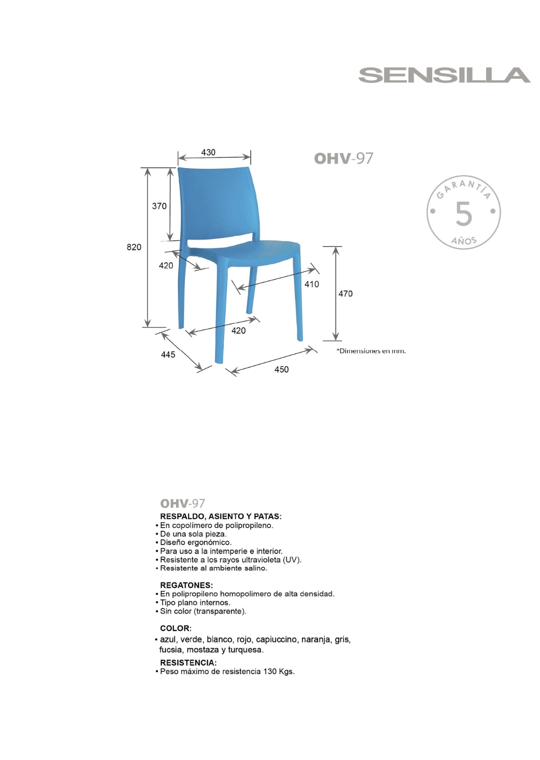 respaldo, asiento y patas: de una sola pieza en polipropileno de alta resistencia y duración para intemperie, resistente a los rayos ultravioleta (UV) y al ambiente salino.