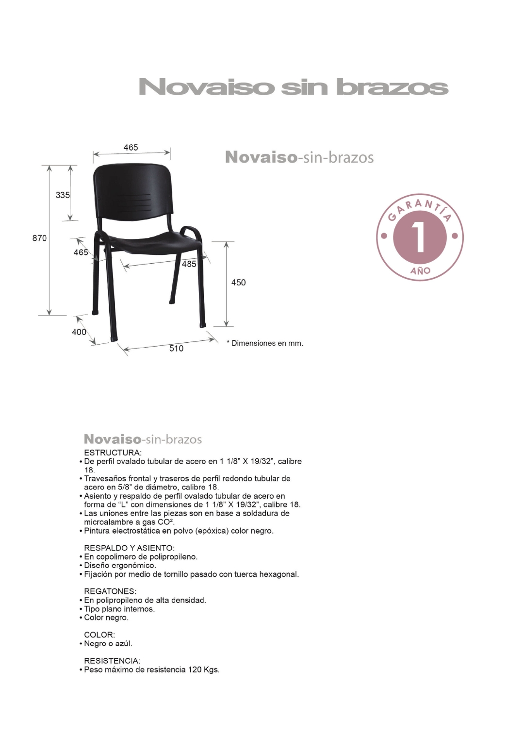 estructura: de acero tubular ovalado de 1 1/8″ X 19/32″, calibre 18; con acabado de pintura epóxica (electrostática) color negro.