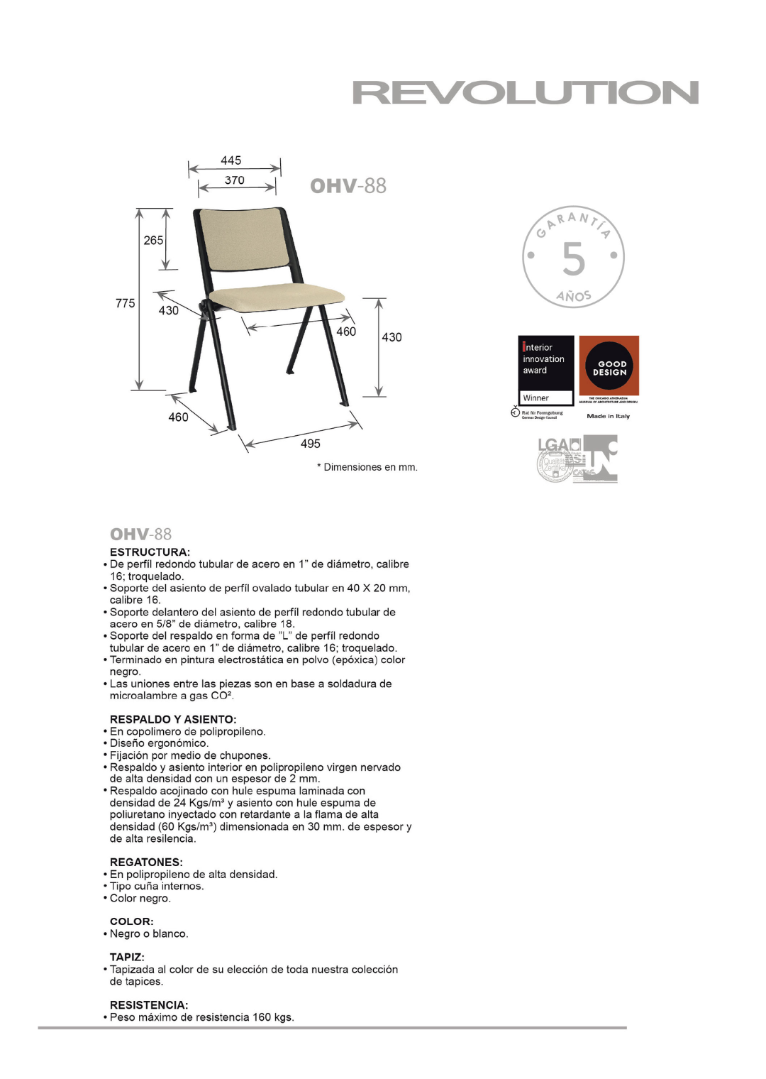 asiento y respaldo: plásticos en color negro o blanco, hule espuma laminado flexible con 24 kgs/m3 de densidad en el asiento y hule espuma de poliuretano inyectado con 60 kgs/m3 de densidad con retardante a la flama en el asiento; de alta resilencia.