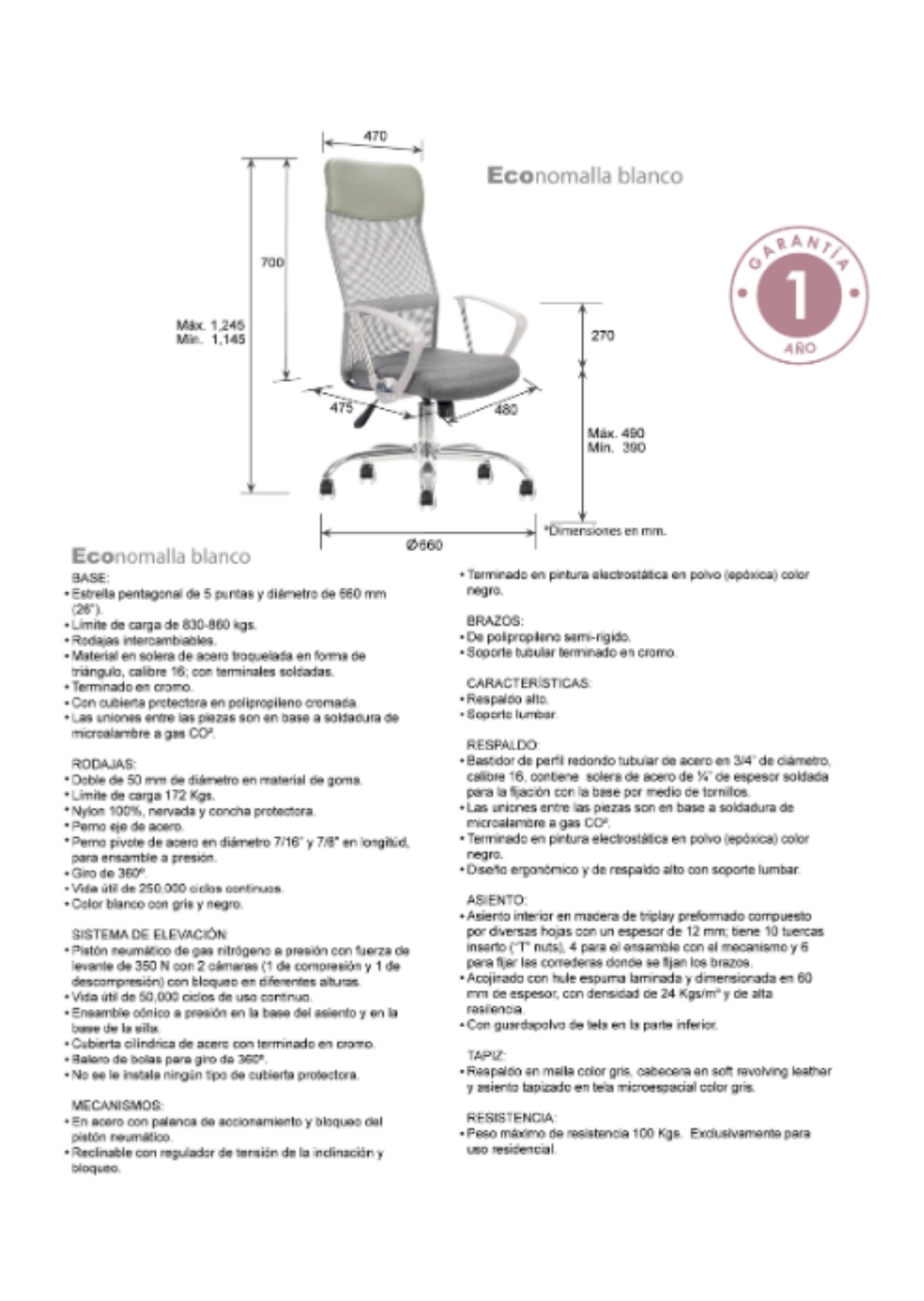 asiento: hule espuma laminada flexible con densidad de 24 kgs/m³ y alta resilencia; brazos de polipropileno semi-rígido con soporte de acero.