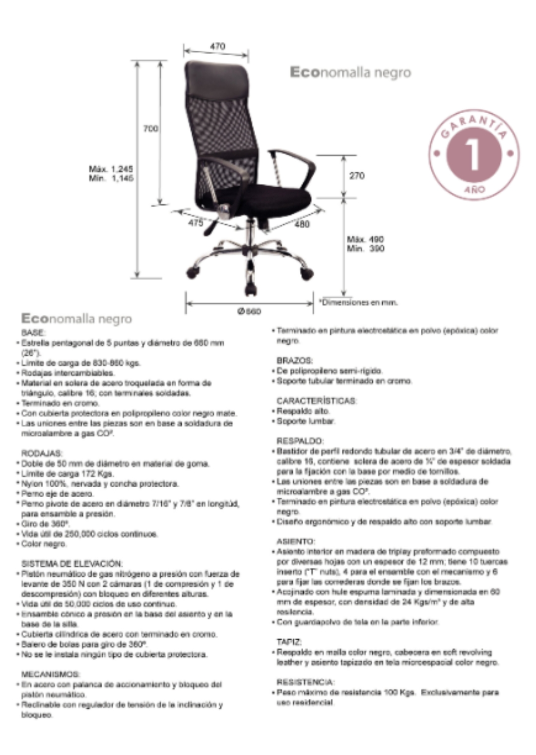 mecanismo: plato de acero reforzado con sistema de reclinación y palanca de bloqueo, perilla de regulación de tensión para el sistema de reclinación.