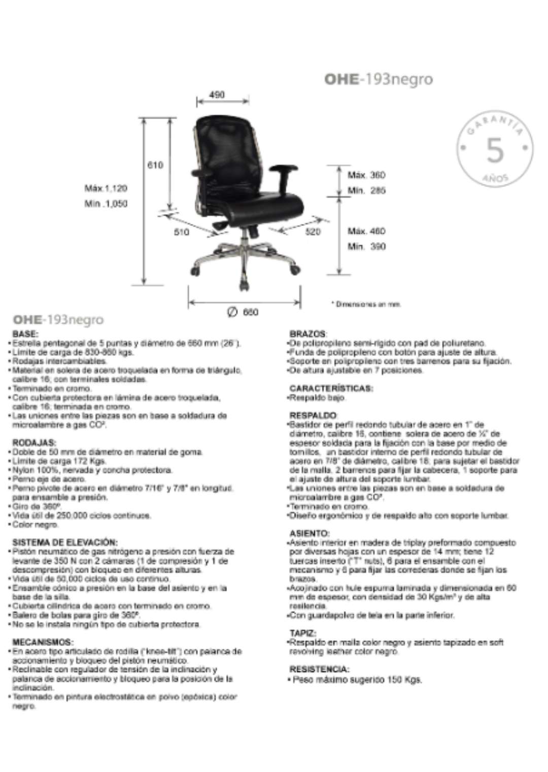 mecanismo: en acero reforzado tipo rodilla articulado (knee-tilt) con sistema de reclinación y palanca de bloqueo, perilla de regulación de tensión para el sistema de reclinación y palanca de bloqueo para la posición de inclinación del respaldo (contacto permanente).
