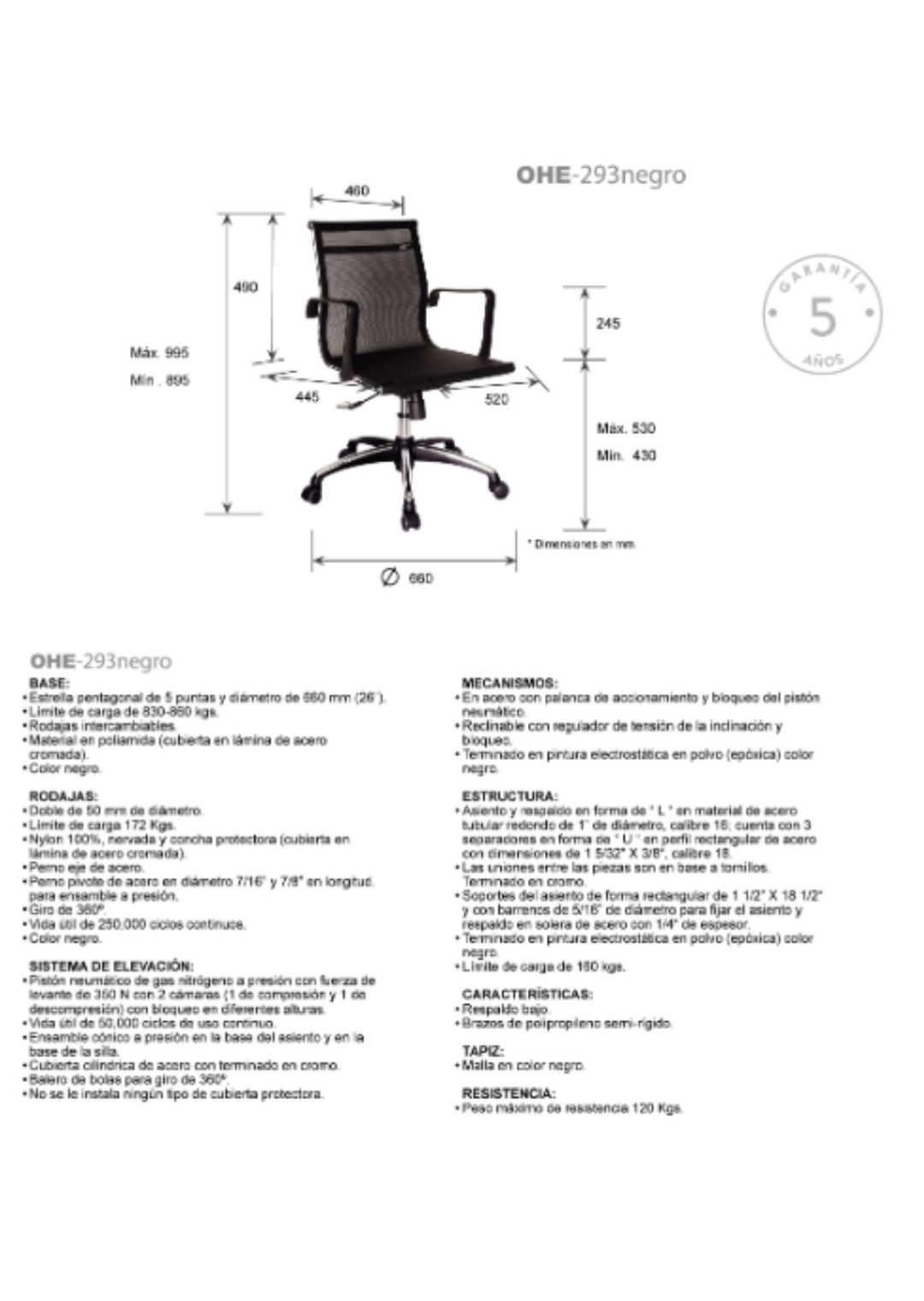 peso máximo de resistencia: 120 kgs.