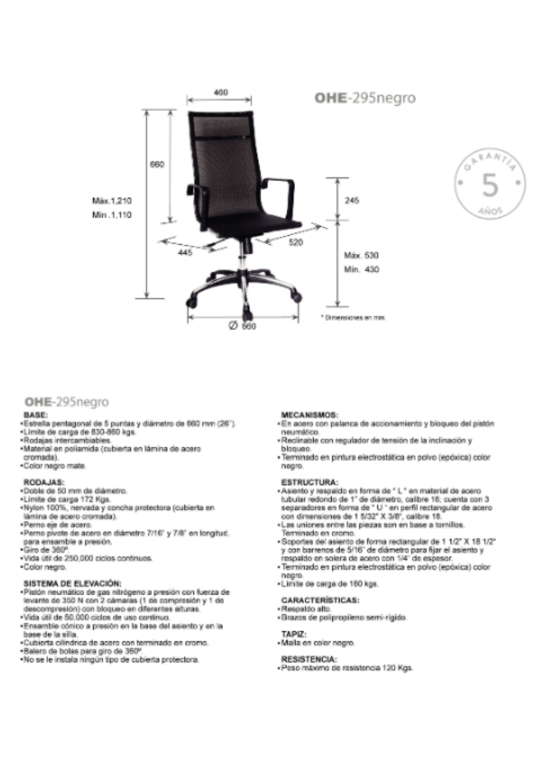 asiento y respaldo: de respaldo alto con bastidor redondo tubular de 1″ de diámetro, calibre 16.