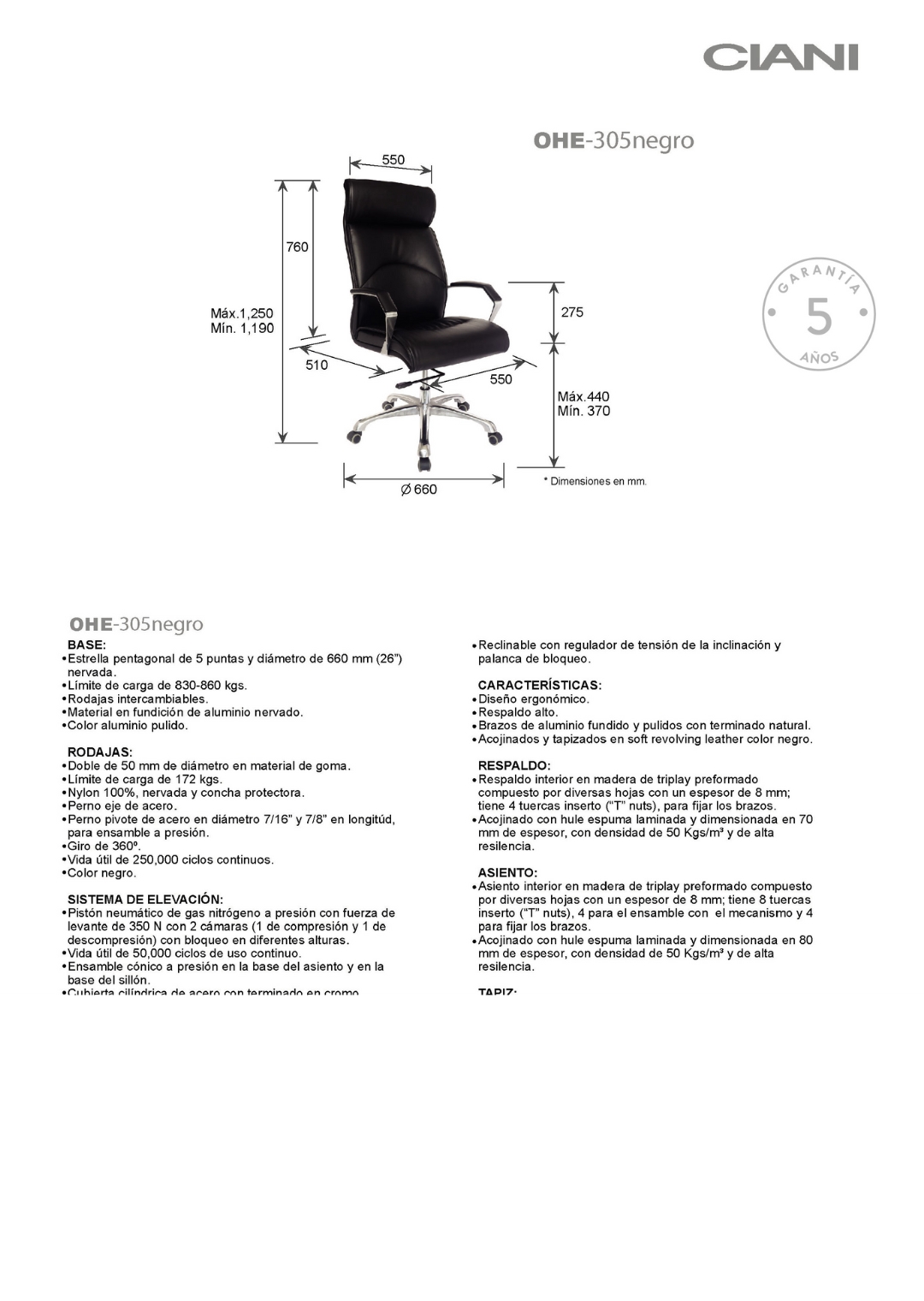 asiento y respaldo: de respaldo alto hule espuma laminado flexible con densidad de 50 kgs/m3 y alta resilencia.