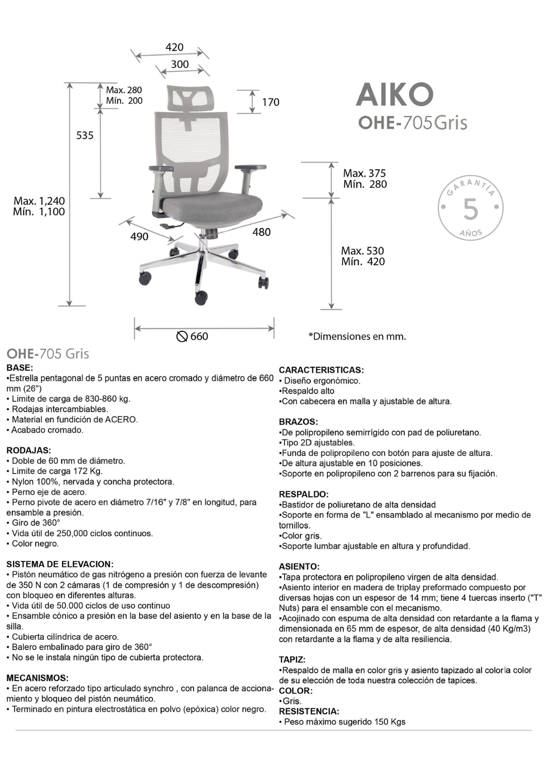 peso máximo de resistencia: 150 kgs.