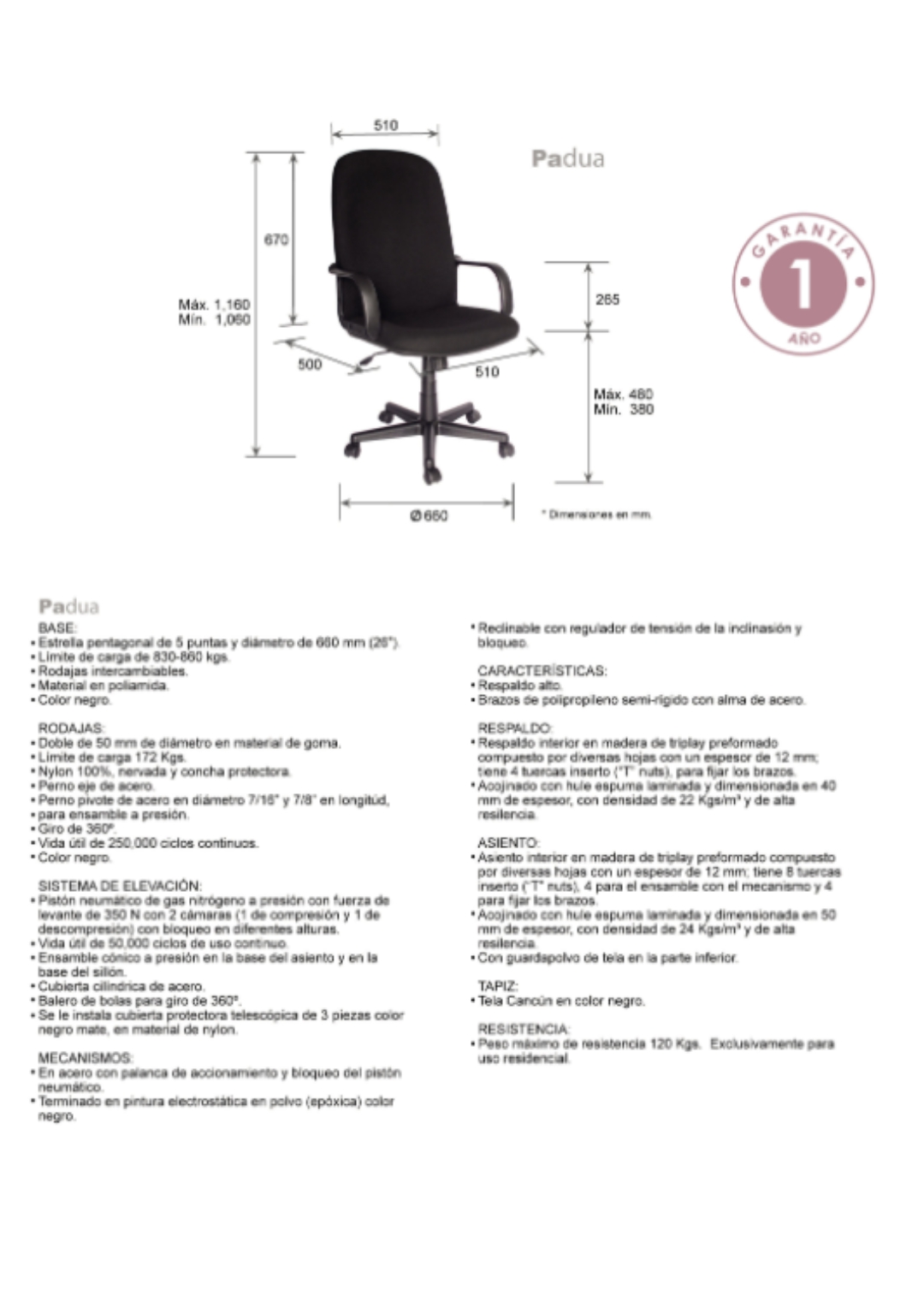 respaldo y asiento: respaldo alto, hule espuma laminado flexible con densidad de 22 kgs/m³ en el respaldo y 24 kgs/m³ en el asiento, de alta resilencia, brazos de polipropileno rígido.