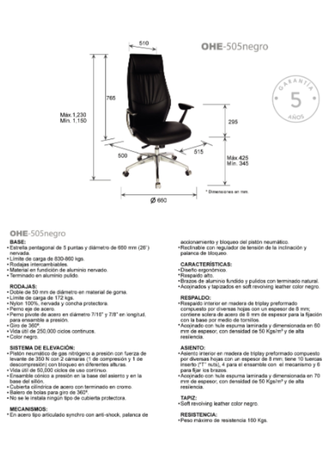 asiento y respaldo: de respaldo alto, hule espuma laminado flexible con densidad de 50 kgs/m3 y alta resilencia.